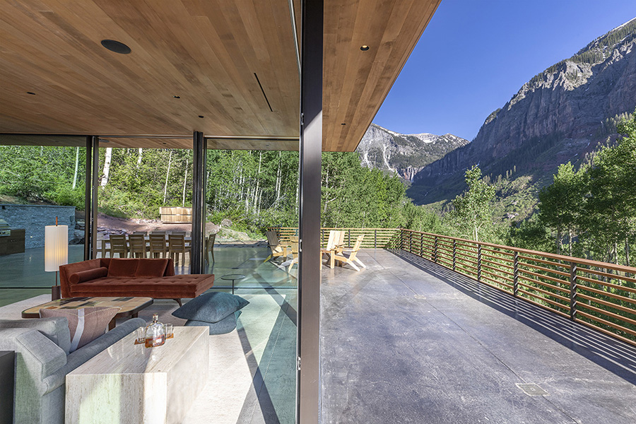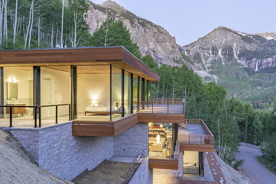 With rock fall and avalanche hazard mitigation beginning in late 2018, Finbro Construction completed this 6,000+ sq. ft. east Telluride home in early 2021. Largely constructed of floor to ceiling, structural glass walls, the home has perpetual views of Bridal Veil and Ingram falls. In addition to the glass walls, the floors consisted of highly polished, stained concrete with Alaskan Yellow Cedar ceilings, seamlessly carried from the interior to the exterior and a very minimalist interior with level 5 drywall butted to walnut doors with a reglet joint carrying from the floors around the door jambs.